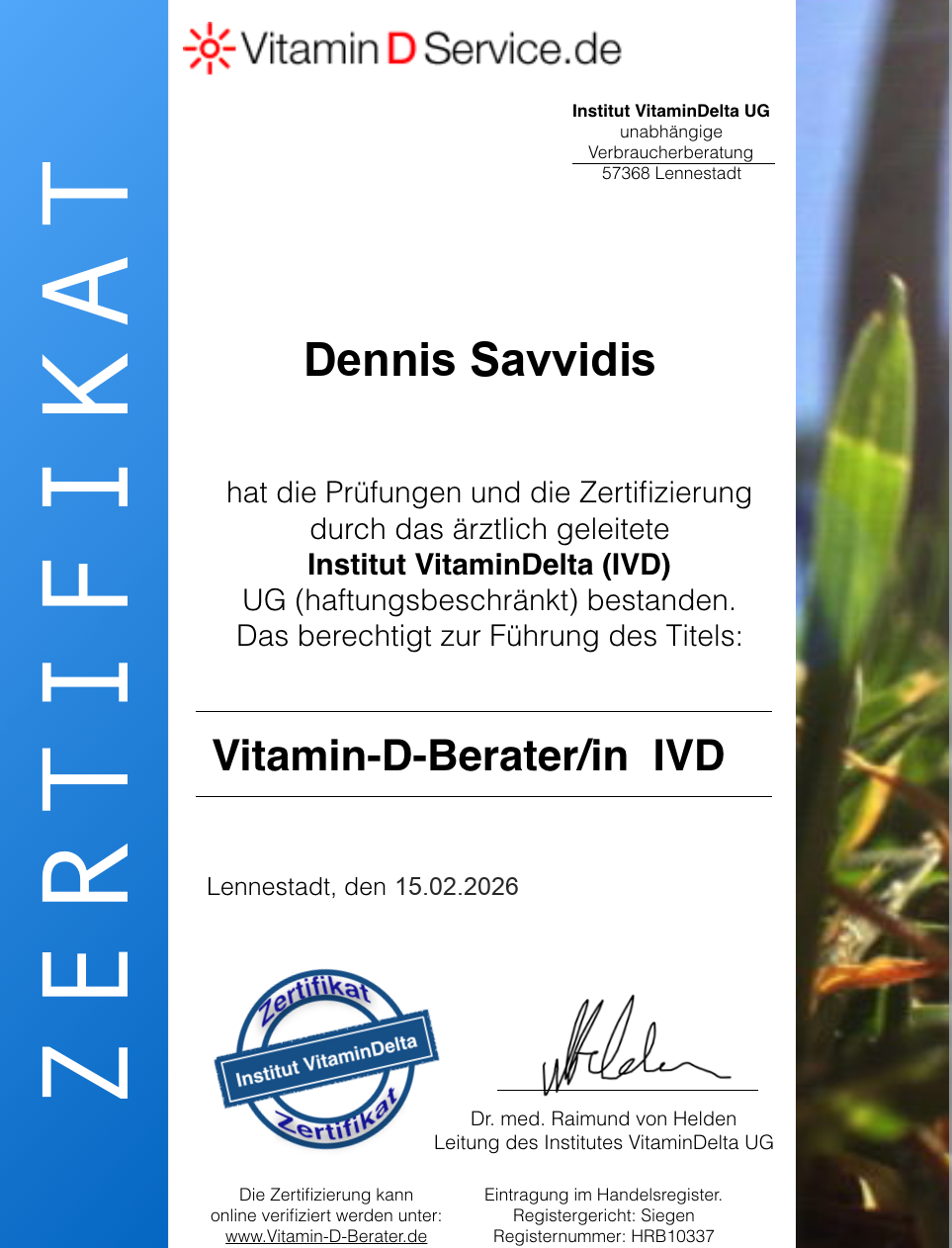 Ich bin Ärztlich Zertifizierter Vitamin D Berater (IVD) vom bekanntesten Vitamin D Profi Deutschlands Dr. Raimund van Helden.